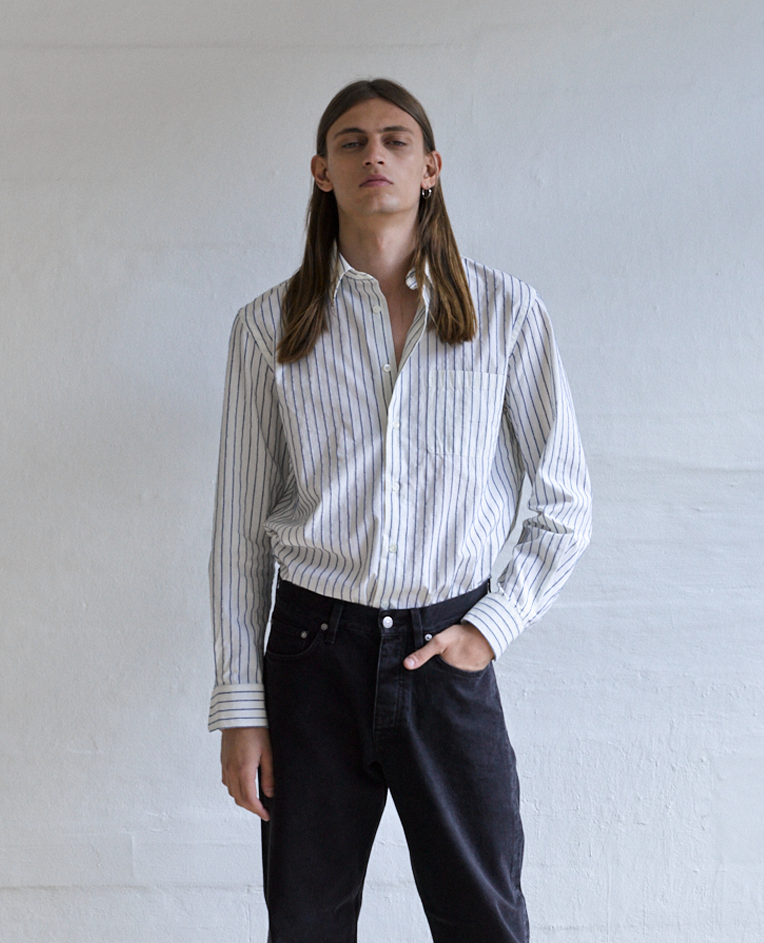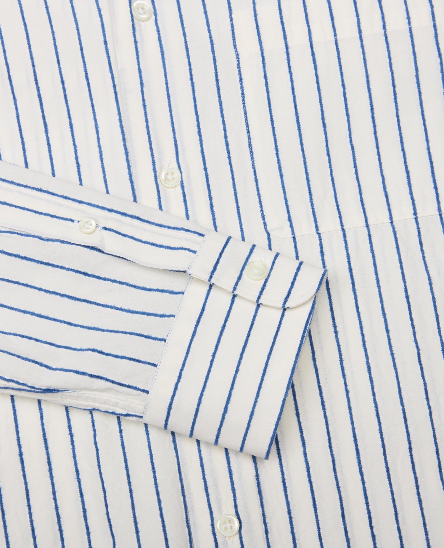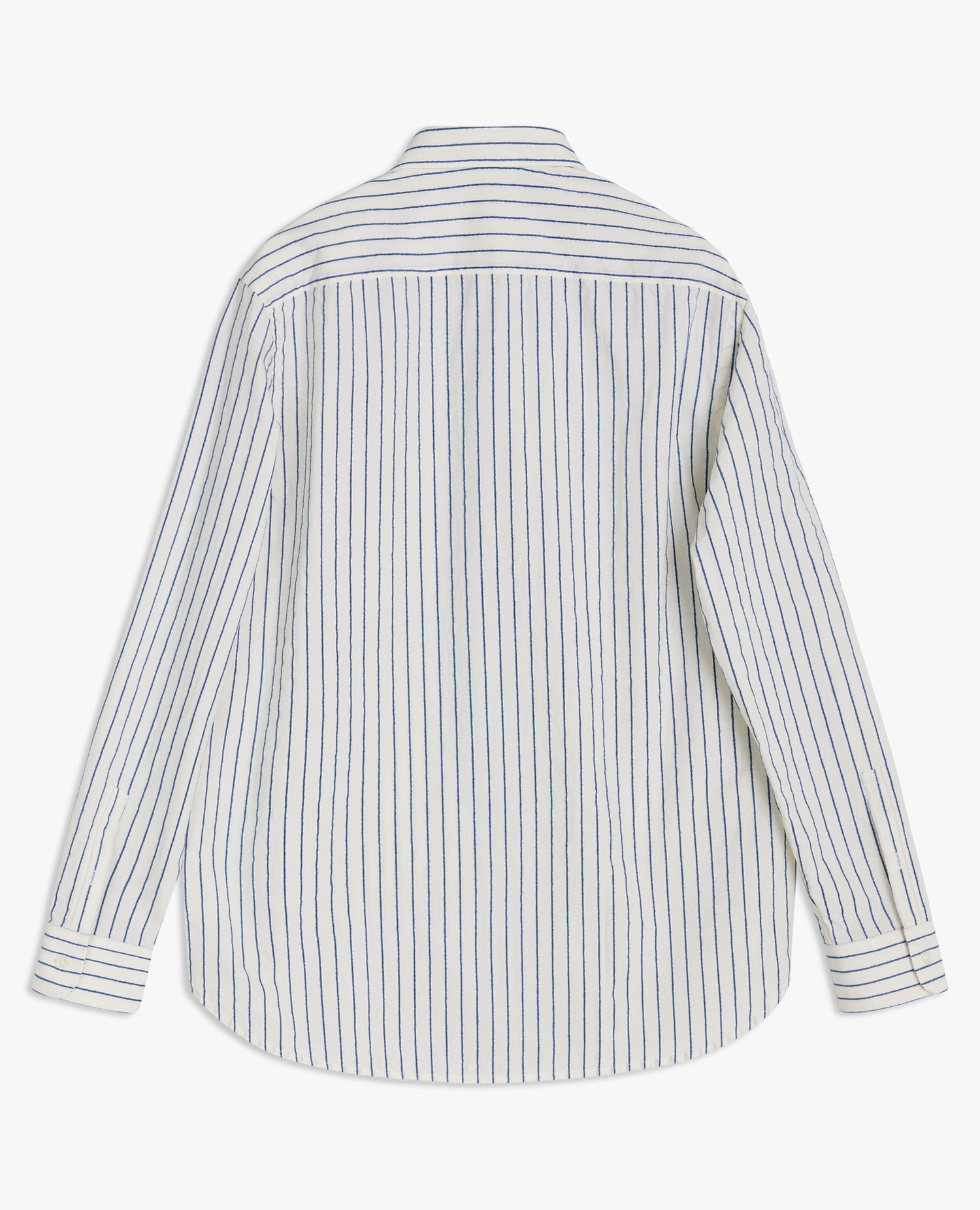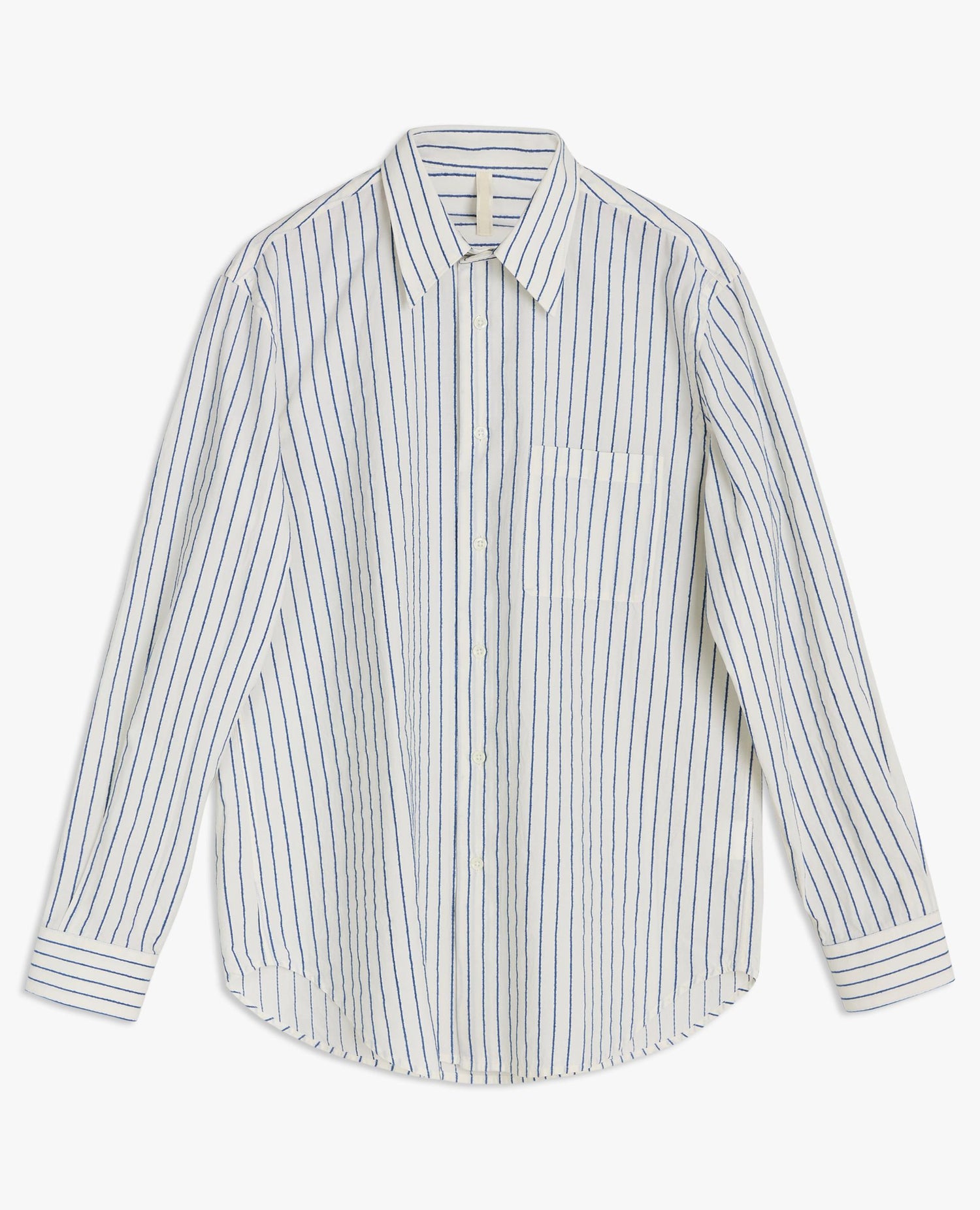 A timeless long-sleeve Oxford shirt featuring a rounded hem and a breast pocket. Made of Italian cotton poplin with a raised high-contrast stripe. Closes with a row of genuine mother-of-pearl buttons.
