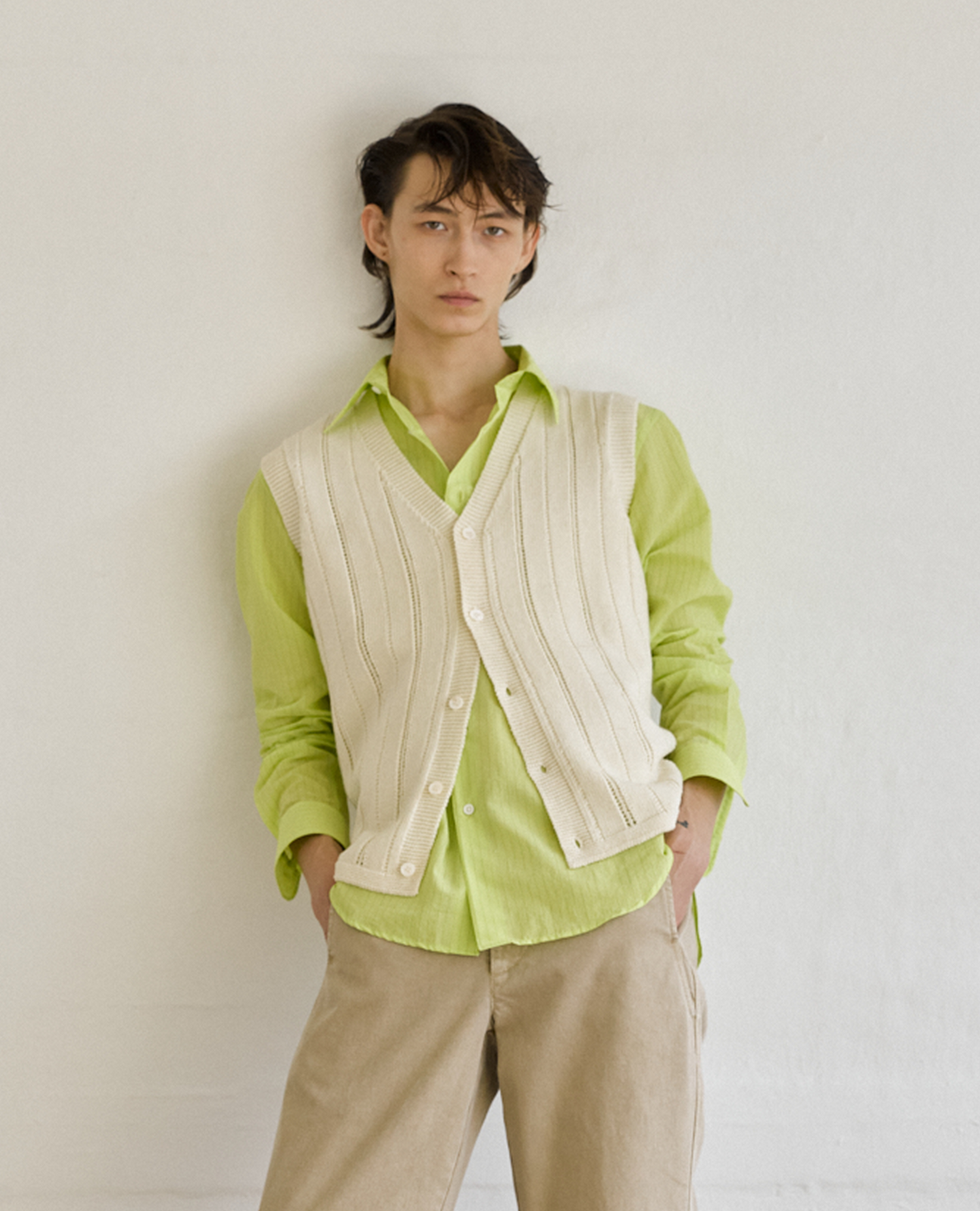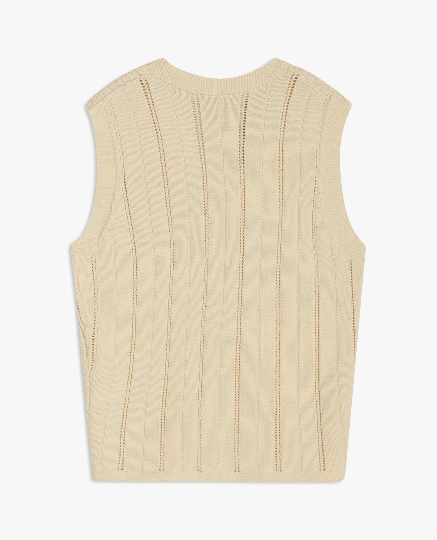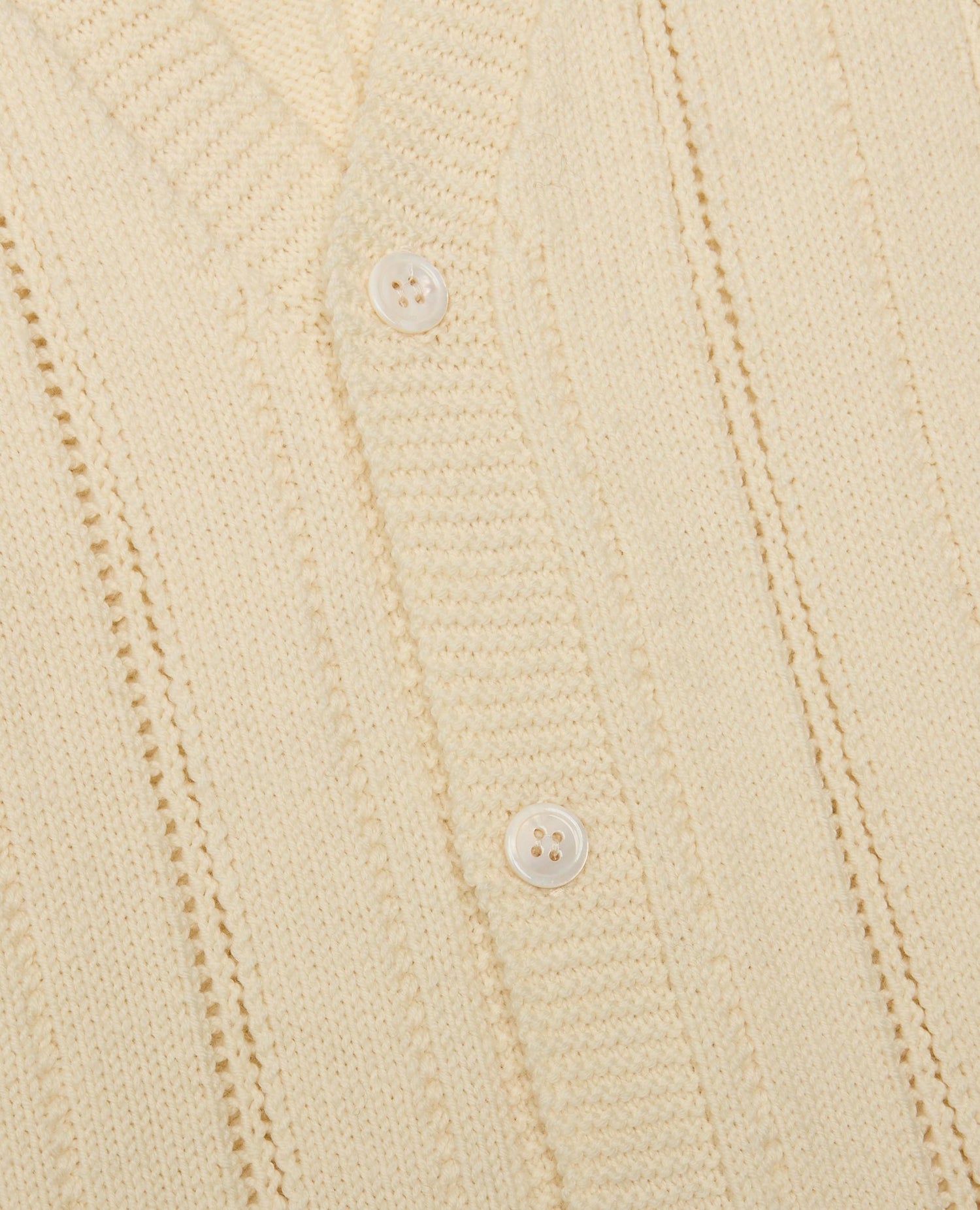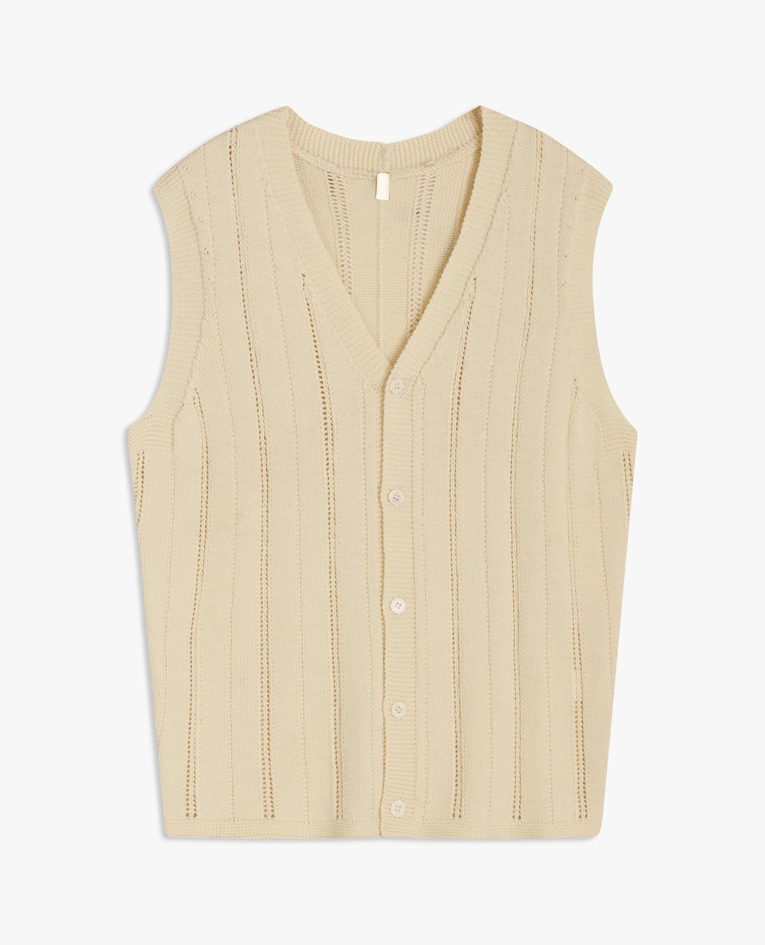 A timeless knitted cardigan vest in a vintage-inspired fit. Made of 100% organic wool, rib stitched with needle drop detailing. Closed with a row of genuine mother-of-pearl buttons.