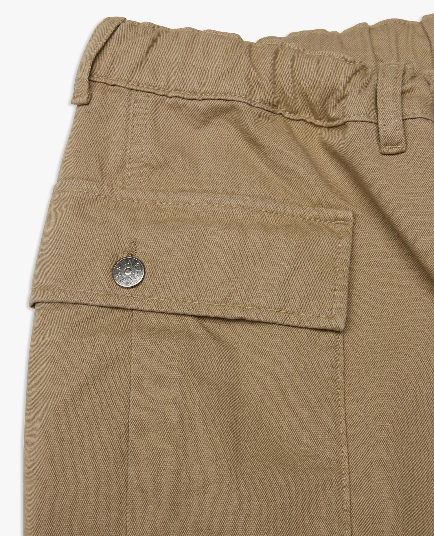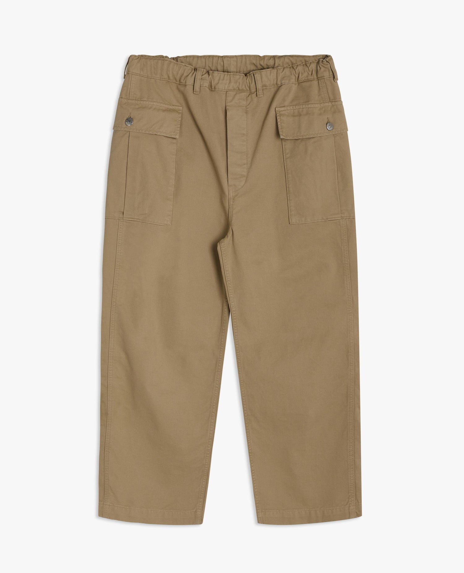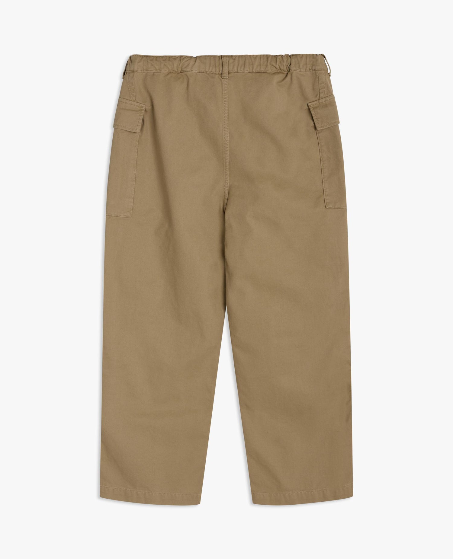 Relaxed-fit cargo pants with an elastic waistband and two spacious flap pockets at the front. Made of dyed 100% cotton twill. Button fly and pockets.