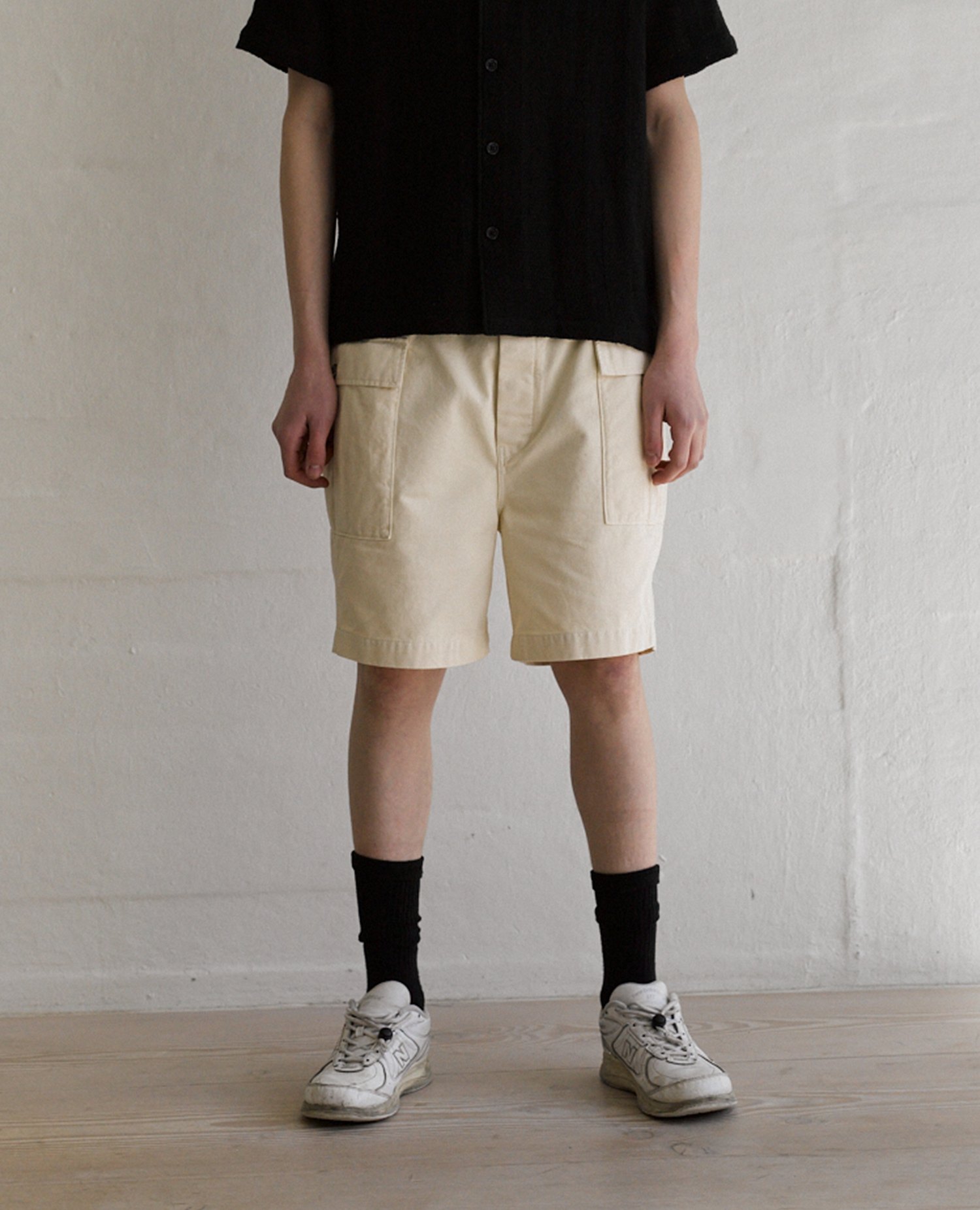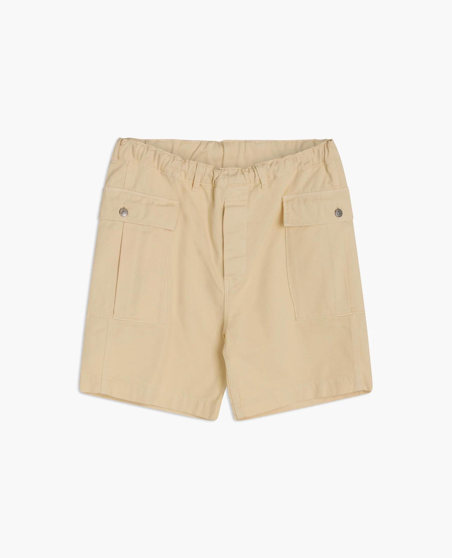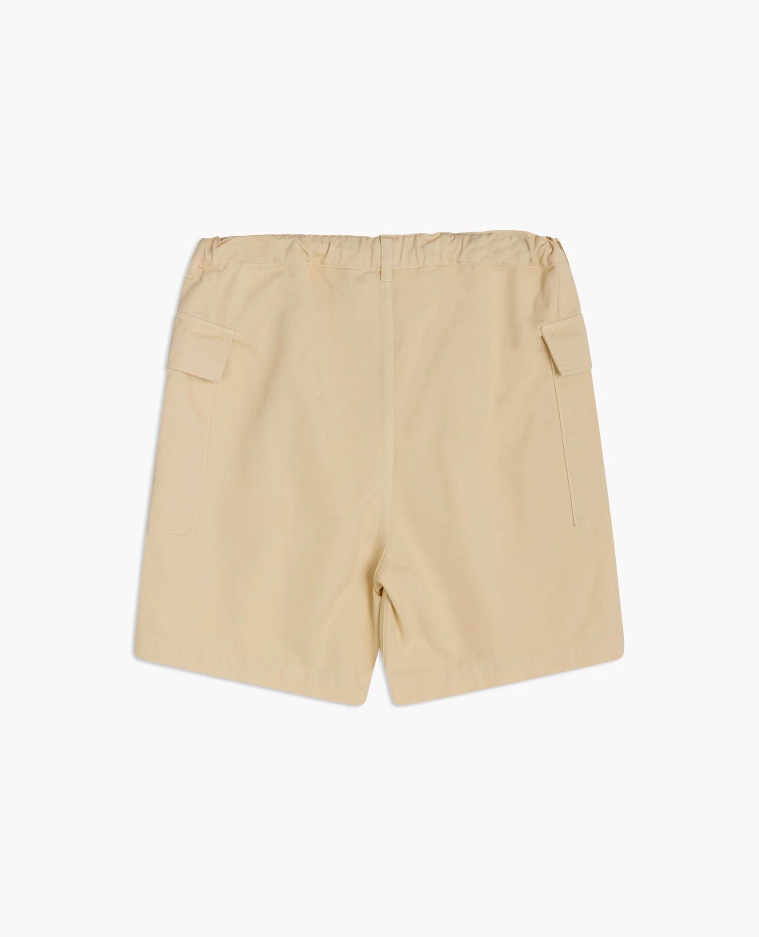 Relaxed-fit cargo shorts with an elastic waistband and two spacious flap pockets at the front. Button fly and pockets. Made of dyed 100% cotton twill.