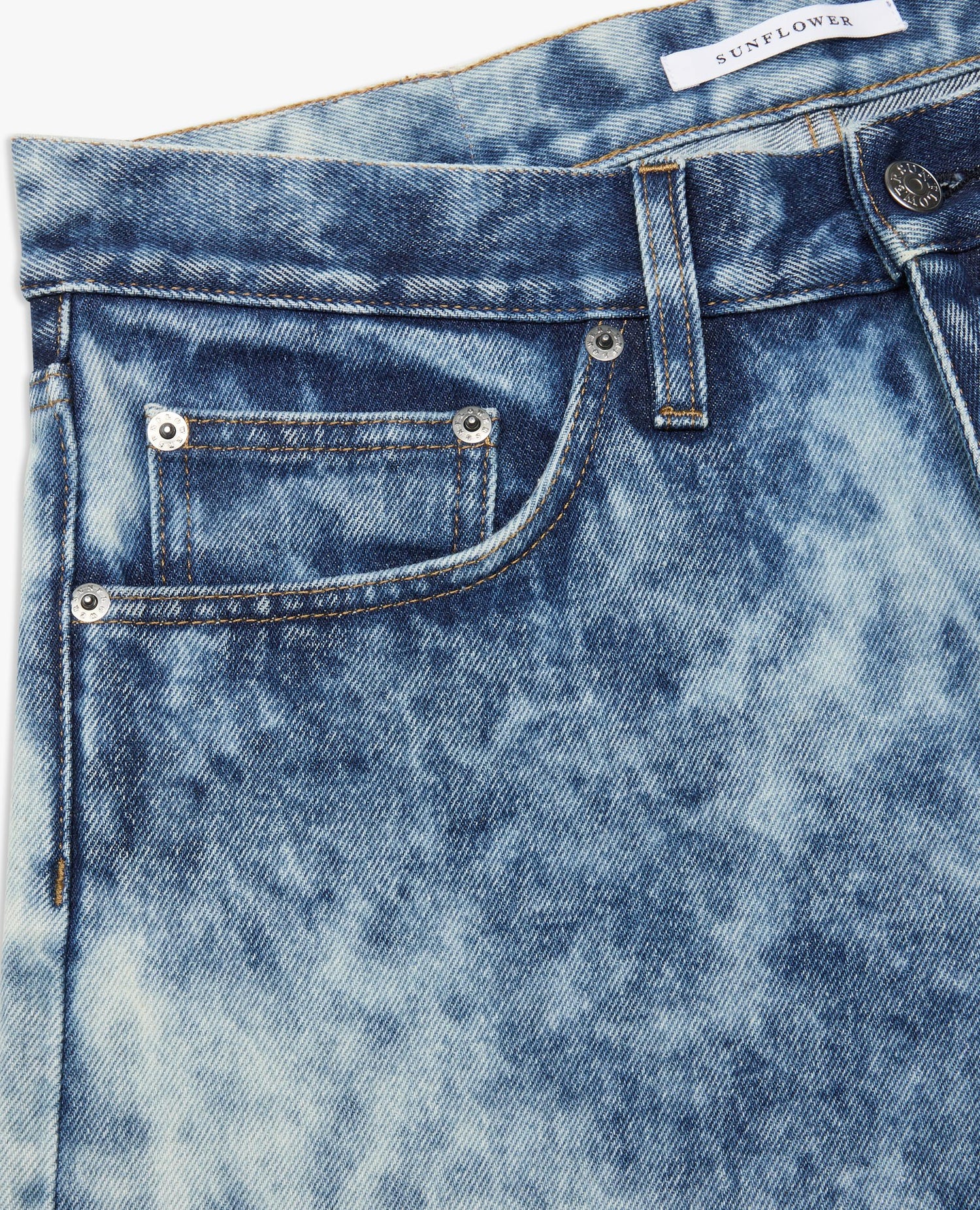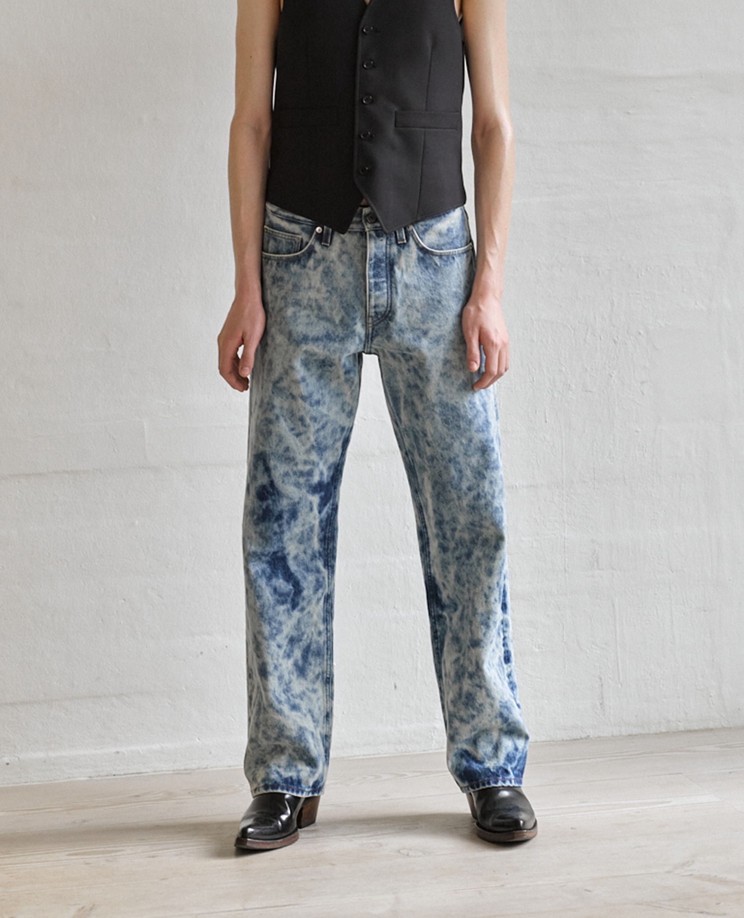 - 13,5 oz Italian cotton denim with a spot-dyed and bleached effect