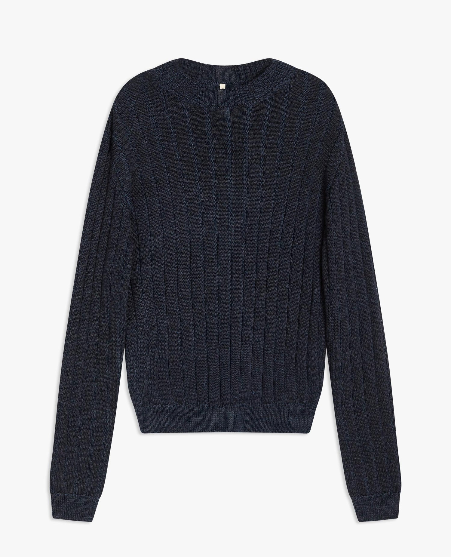 A knitted crew neck jumper in a loose rib stitch. Knitted with shiny rayon blend yarn.