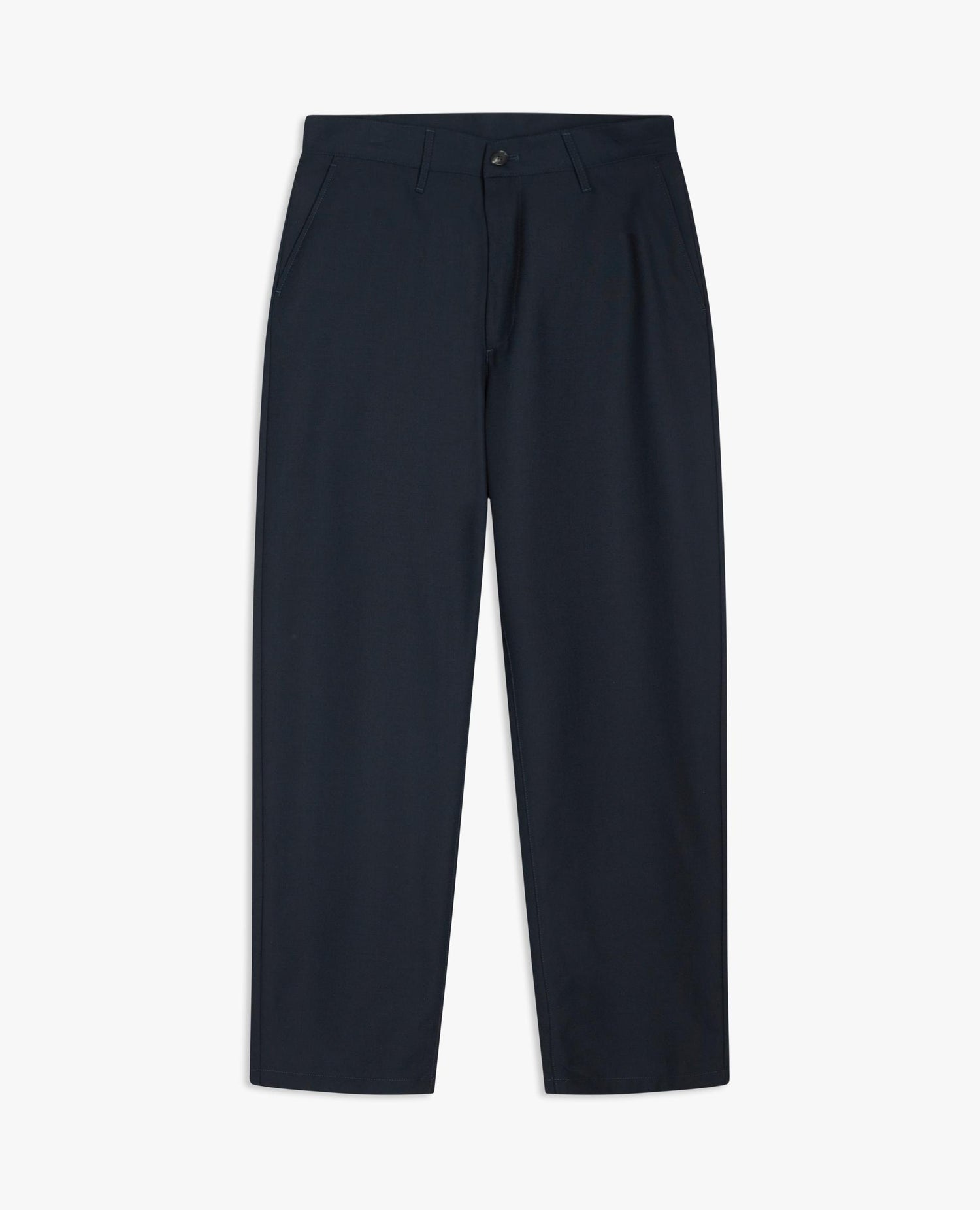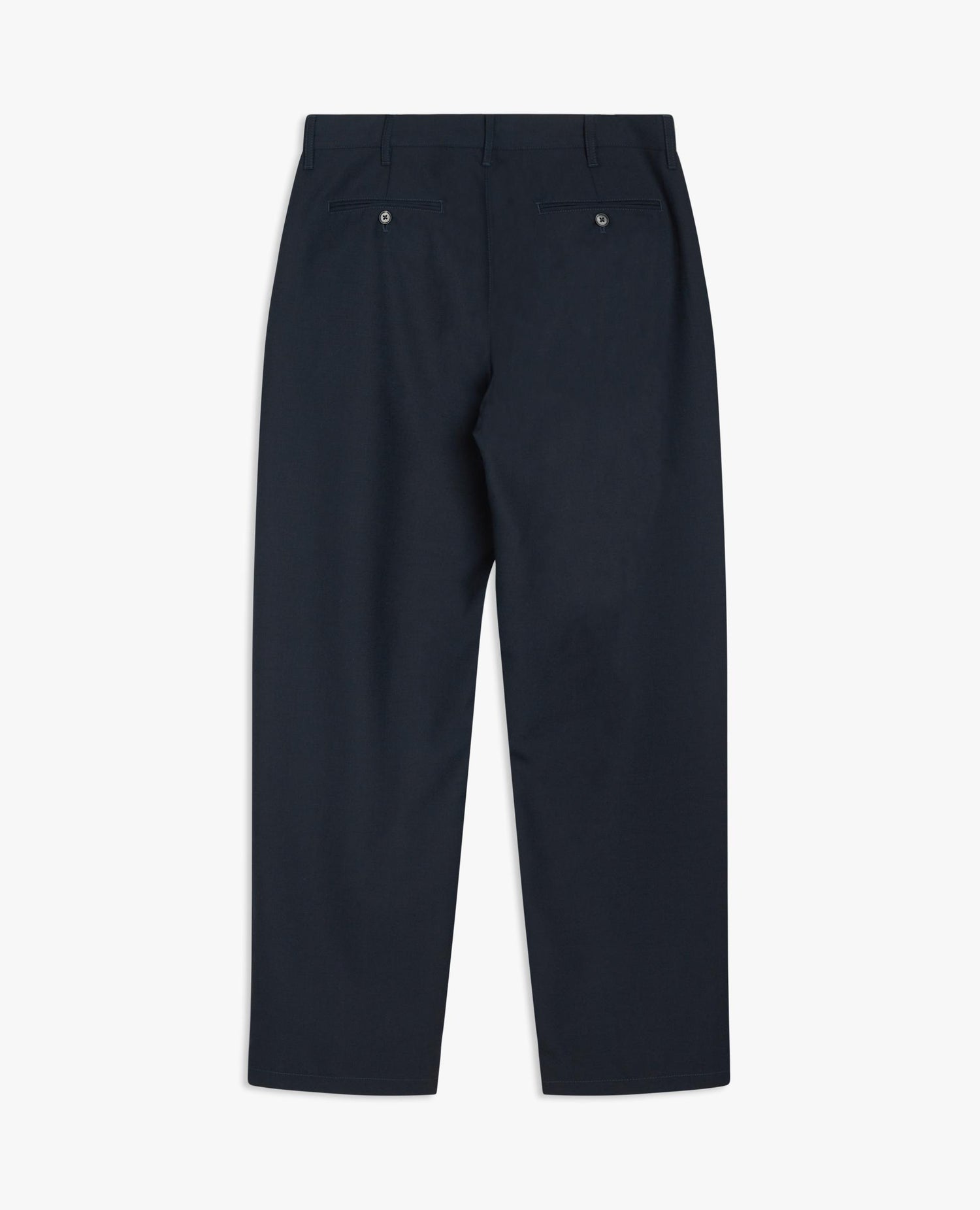 Classic relaxed-fit trousers with horn buttons and silver metal zip fly. Made of a medium-weight wool blend in a plain weave.