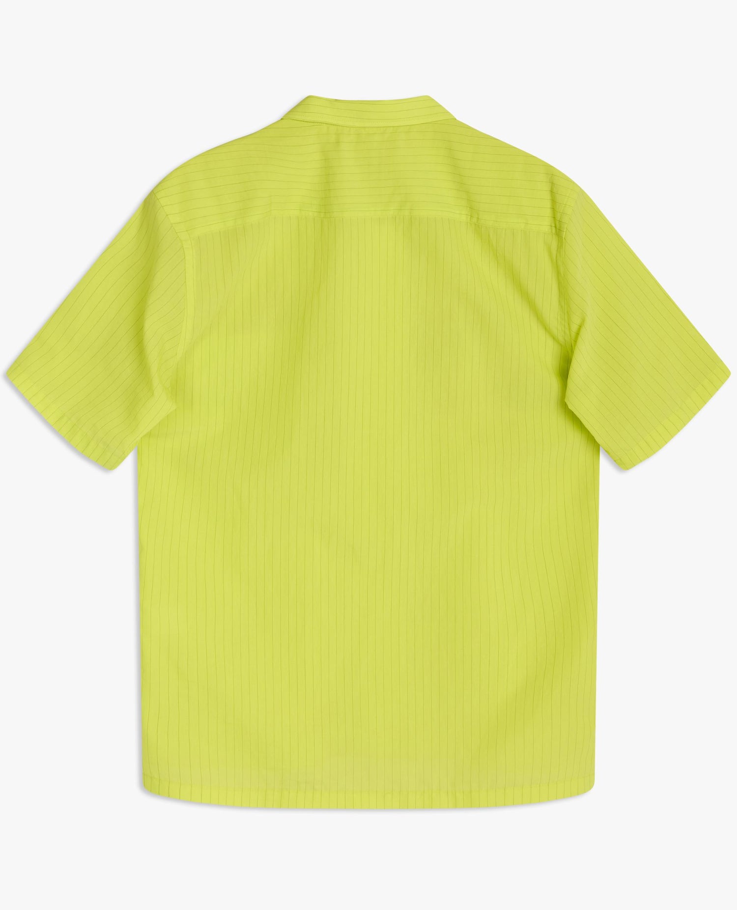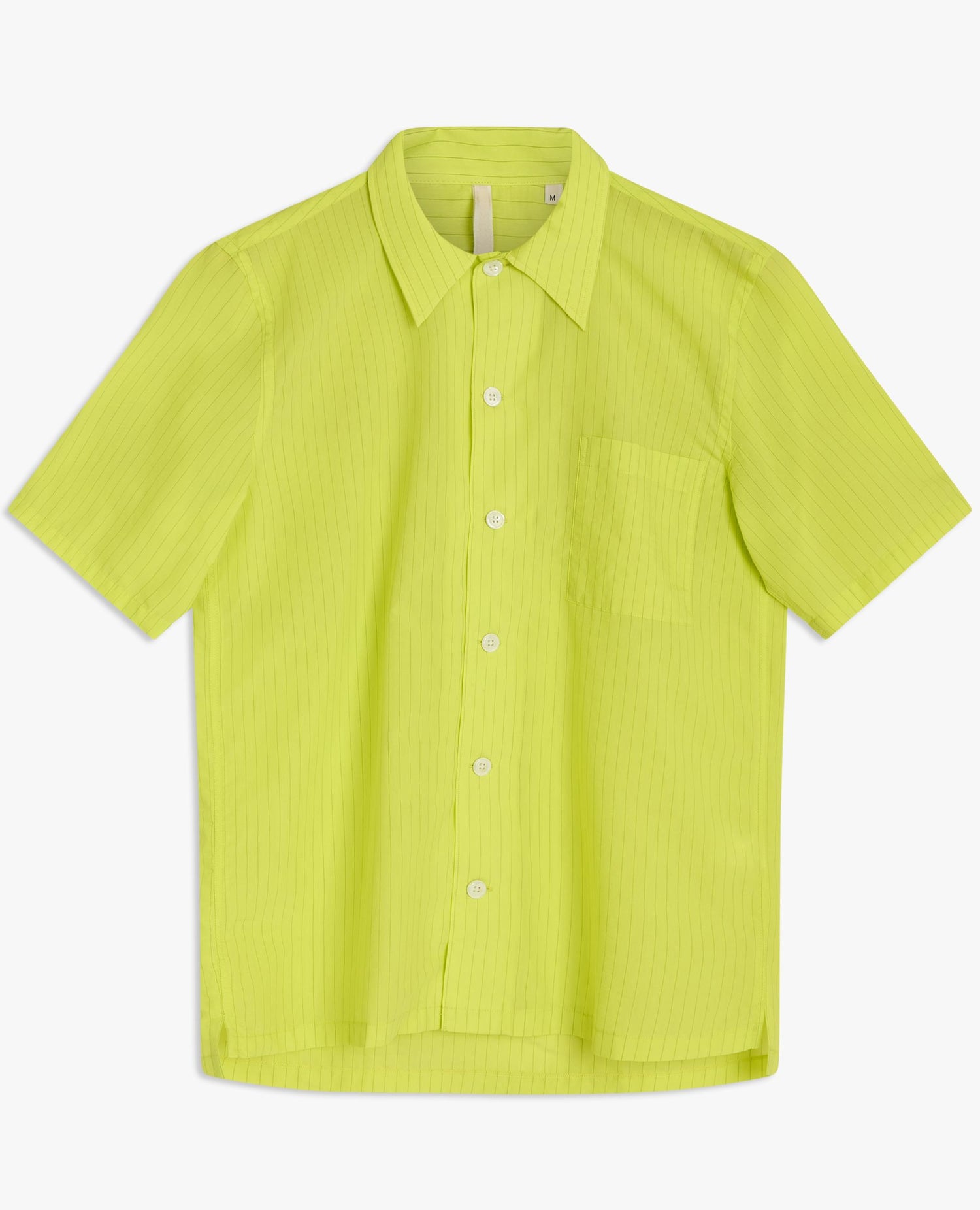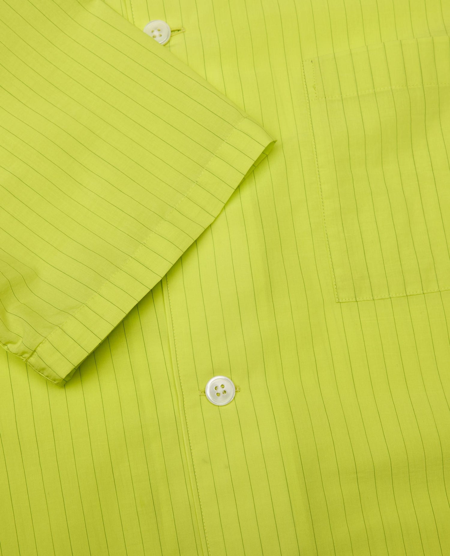 A lightweight short-sleeved shirt with a straight hem. Made of an Italian poplin with a ticking stripe. Closed with genuine mother-of-pearl buttons.