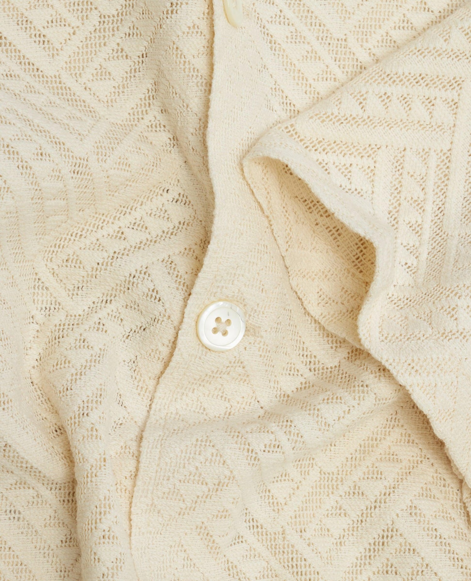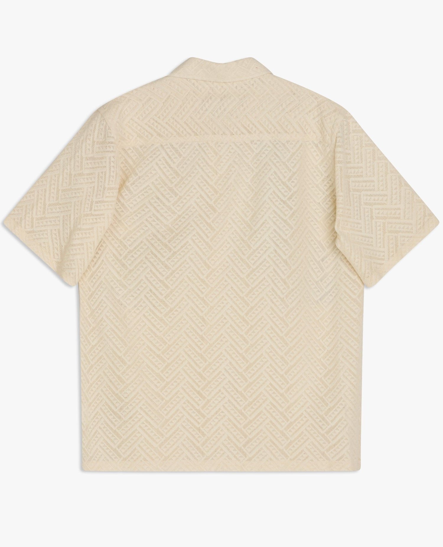 A striking short-sleeve shirt featuring a relaxed fit and a straight hem. Its herringbone-patterned fabric is loosely woven and lightly washed. Closed with genuine mother-of-pearl buttons.